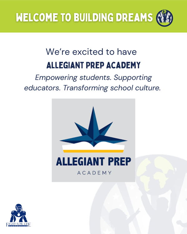 Fight for Life Foundation is thrilled to welcome Allegiant Prep Academy as our newest Building Dreams partner school. Together, we’ll empower students, support educators, and help strengthen school culture through encouragement, mentorship, and character-building opportunities. This partnership expands our ability to reach more young people with the support they need to grow and succeed. Welcome to the Fight for Life, Allegiant Prep Academy!