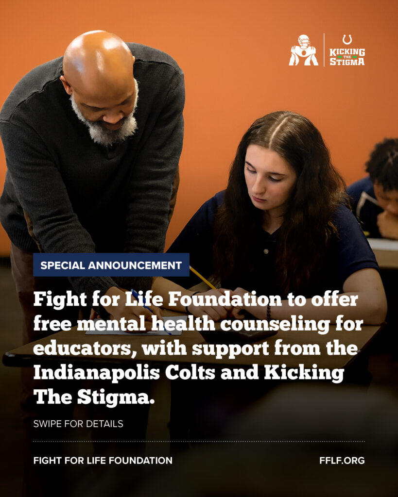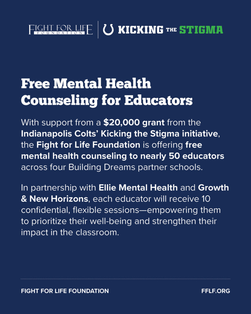 (INDIANAPOLIS) – October 24, 2025 – Fight for Life Foundation (FFLF) with the support of a $20,000 grant from the Indianapolis Colts’ Kicking the Stigma, has activated a new initiative to provide nearly 50 educators with free mental health counseling sessions in partnership with Ellie Mental Health and Growth & New Horizons.