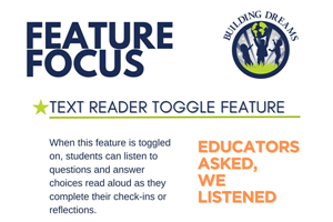 We’re excited to highlight the Text Reader Toggle in Building Dreams! When this feature is turned on, students can listen to questions and answer choices read aloud as they complete their check-ins or reflections. This tool helps support emerging readers, struggling readers, and English language learners, making it easier for all students to understand prompts […]